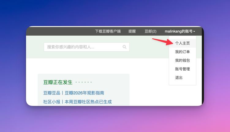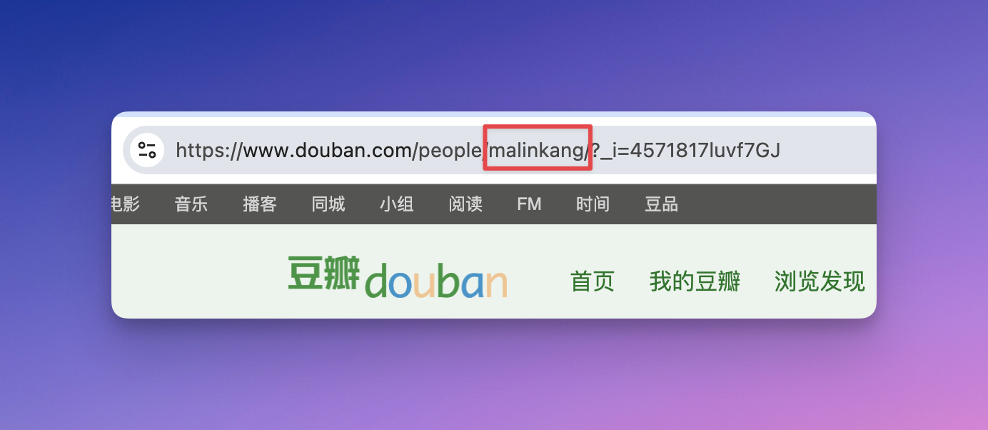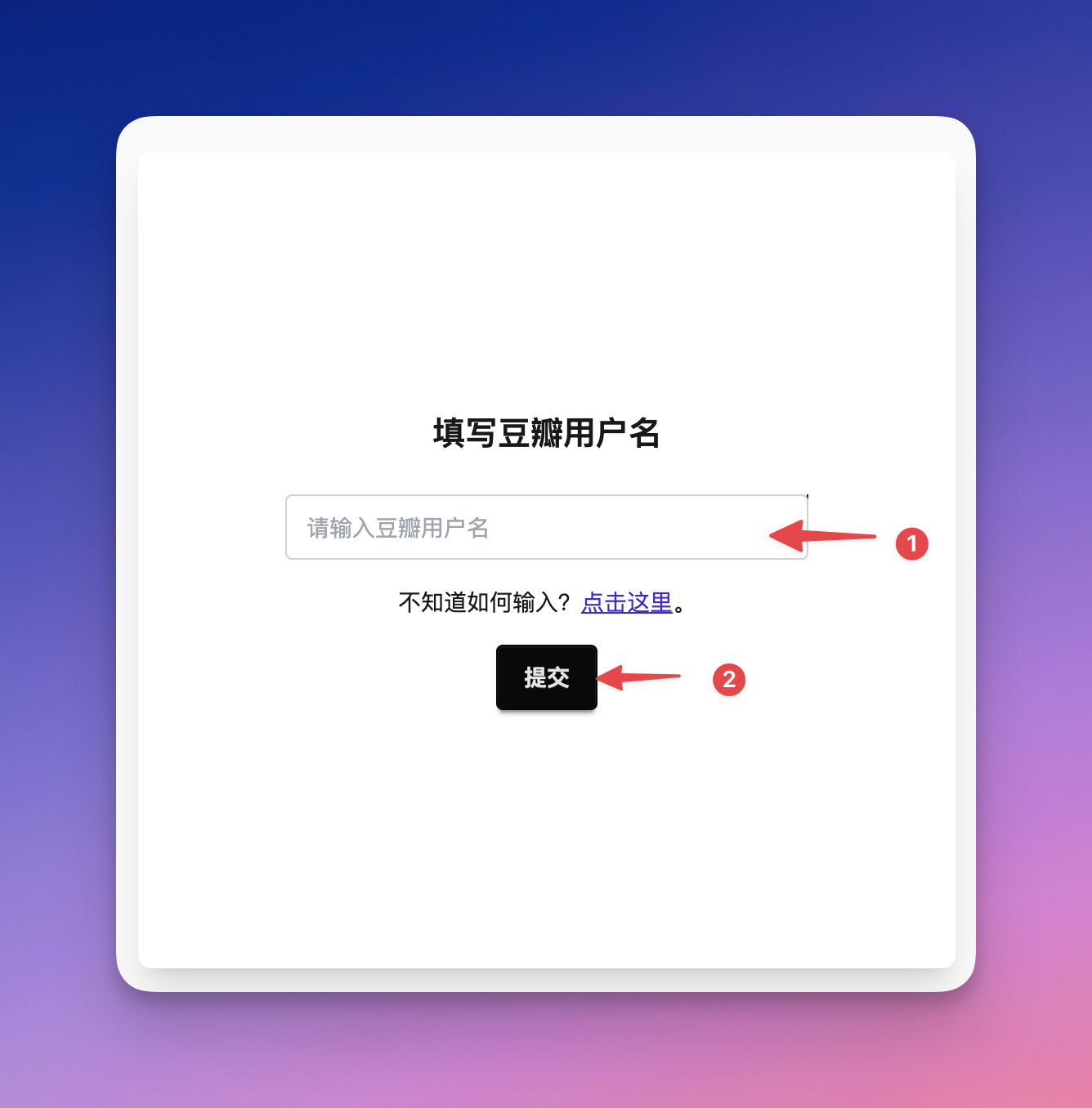 打开豆瓣:https://www.douban.com/, 然后点击个人主页,查看浏览器里的网址,people/后面到下一个/之间的字符串就是用户名。比如我的是 https://www.douban.com/people/malinkang/?_i=4571642luvf7GJ, 那么我的用户名就是malinkang。获取成功之后回到插件输入并点击提交按钮。